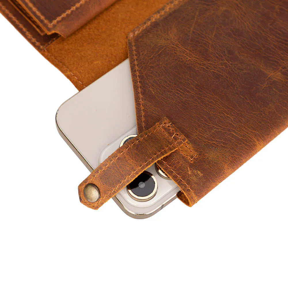 Bologna wallet is a functional wallet that fits everything you need in one place, including your phone and cards. The wallet is made from an authentic leather material with a distressed finish. The unique aesthetic of the wallet gives it a rustic look. The design is long, along with the option of multiple secure pockets, so that you can find your items quickly and easily when neededFeatures