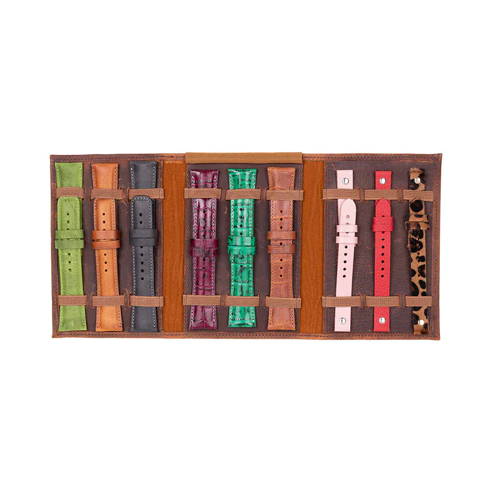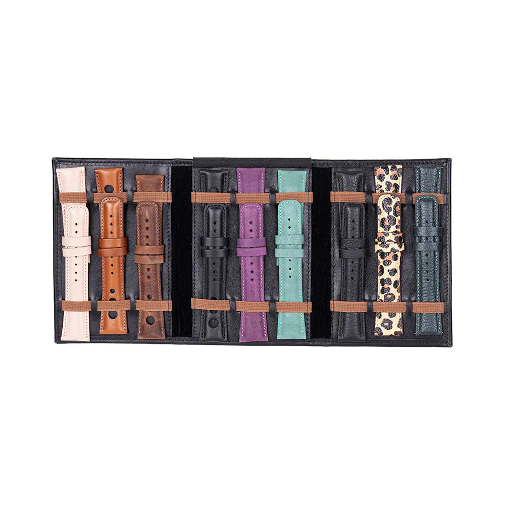 Keep your equipment in order as you travel using this Leather Watch Band Triple Organizer. Designed to hold Apple Watch bands, FitBit watch bands, and standard watch straps, this trendy organizer keeps your collection safe and in order